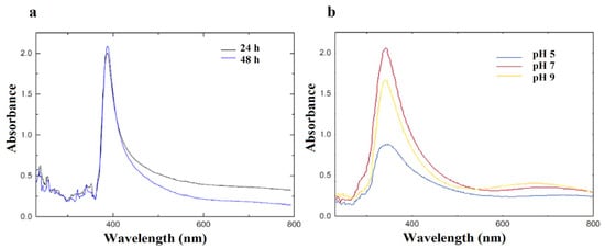 UV-vis spectra for CuNP synthesis. (a) After 24 and 48 h of reaction. (b) Reactions at different pH.