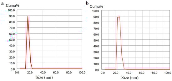 The size characterization DLS showed a single population with a hydrodynamic diameter of 17.5 ± 1.1 nm and a polydispersity index (PDI) of 0.211, and 26.4 ± 2.2 nm, PDI 0.302, for AgNPs and CuONPs, respectively (Figure 4a,b). Both NPs showed slightly polydisperse distributions (PDI < 0.4).