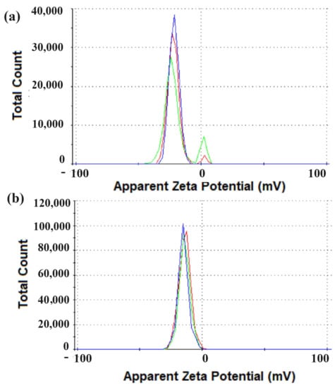 Measurements of the ζ-potential showed that AgNPs had a net negative surface charge, −21.5 ± 6.0 mV (Figure 5a). Similarly, CuONPs showed a net negative surface charge of −13.9± 4.9 mV (Figure 5b).