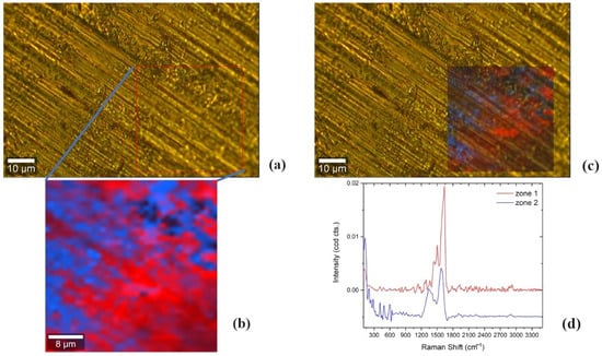 Furthermore, the CRM results affirmed the existence of CuO nanoparticles. A hyperspectral image of 40 × 40 μm was processed in a grid of 40 × 40 points, then analyzed using True Components in WITec Project 5 Plus [30]. As can be observed in Figure 7, two main regions could be distinguished in the sample, Zone 1 and Zone 2, after multivariate hyperspectral analysis. Zone 1 and Zone 2 correspond to regions with low and high concentrations of CuO nanoparticles, since the peaks associated with it could be confirmed by the following Raman shift positions: 282, 325, and 606 cm−1 [14,31]. In the case of a region with a low concentration of CuO nanoparticles, the observed bands were mainly located at: 1285, 1362, 1441, 1502, 1580, and 1615 cm−1, and they could be attributed to several amino acids, such as l-valine, l-serine, and l-tryptophan [29]. While spectra typically exhibit similarities, a closer examination revealed that the bands in the range of 700 to 1800 cm−1 underwent alterations, including shifts in wavenumber and alterations in intensity. These changes may result from the impact of the presence of nanoparticles and their proximity interactions with the biological sample. Furthermore, the nanoparticles may cause signal enhancement, resulting in comparatively greater intensity variations.