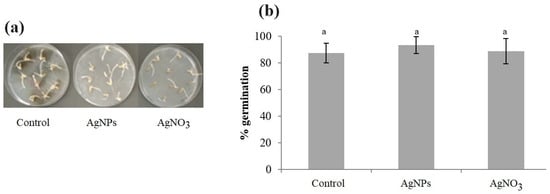 The purpose of this test was to verify that the nanoparticles did not negatively affect the germination of wheat and rice seeds, and to evaluate the effect on seed-borne fungal growth. The treatment with AgNO3 (5 mM) slowed down the germination of wheat seeds at 3 days of incubation (Figure 8a). However, wheat seeds treated with AgNPs (55 pM) showed germination and development of radicles that were similar to control seeds. Furthermore, AgNO3 and AgNPs showed total and partial inhibition of the microbial growth, respectively, compared with the control. Although, after 6 days of incubation, no significant differences in germination were found among the treatments (p > 0.05), a tendency towards higher germination of wheat seeds treated with AgNPs compared to the control and to AgNO3 was observed (Figure 8b).