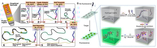 (A) Morphologically encoded non-fouling hydrogel particles for multiplex miRNAs detection with RCA [54]. Reproduced with permission from Anal. Chem., published by American Chemical Society, 2011. (B) Fluorescent hydrogel array for miRNA-21 detection based on HCR coupled with interfacial cation exchange amplification [55]. Reproduced with permission from Anal. Chim. Acta, published by Elsevier B.V., 2019.