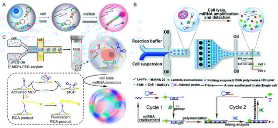 (A) Hairpin DNA isothermal amplifier for the catalytic signal enhancement of miRNA-21 expression in a single cell [56]. Reproduced with permission from Lab Chip, published by The Royal Society of Chemistry, 2018. (B) Quadratic isothermal amplification for single-cell miRNAs analysis in water-in-oil droplets [57]. Reproduced with permission from ChemComm, published by The Royal Society of Chemistry, 2019. (C) Single-cell multi-miRNAs quantification by DNA cascade amplifications in hydrogel microbeads for cell subtype discrimination [58]. Reproduced with permission from Chem. Sci., published by The Royal Society of Chemistry, 2022.