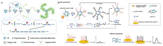 Extracellular vesicles (EVs) are lipid bilayer confined particles that are naturally secreted from almost all types of cells and found to circulate through many different body fluids [59,60]. Tumor cells related EVs contain cancer-related information and participate in intracellular communication and pathological processes [61], which makes them a potential biomarker for cancer diagnosis. However, the small size (30–200 nm) of EVs and low expression of surface biomarkers result in detection difficulty. DNA-based signal amplification technologies are widely utilized to improve detection sensitivity. Taking advantage of target-initiated DNA cascade reactions on the EVs’ membrane, Zhong et al. realized the visualization of a single extracellular vesicle via traditional flow cytometry and revealed the heterogeneity of EVs (Figure 3A) [62]. To perform target-initiated signal amplification, a conformation-switchable DNA probe was designed to recognize CD63, which is a surface protein marker in various EVs. Upon target recognition, the DNA probe changed its configuration and exposed toehold to initiate HCR on the vesicle membrane. The resulting fluorescent HCR products not only increased the physical size of a single EV, but also amplified the signal for surface biomarkers with low expression, enabling the visualization of single EVs in a conventional flow cytometer. Li et al. developed an electrochemical detection strategy based on DNA cascade signal amplification reaction on vesicle membrane (Figure 3B) [63]. Aptamer-modified magnetic beads which recognize EVs membrane proteins CD63 and EpCAM were anchored on EVs surface for magnetic separation. Cholesterol functionalized primer strands were anchored into the EVs membrane via hydrophobic interaction to form SNAs and subsequently extended to a polyT strand. Methylene blue (MB) group, as the electroactive molecule, was modified on a polyA DNA strand and hybridized with a polyT DNA strand for signal amplification. The as-obtained polyT-A hybrid was then cleaved by Exo III and released the polyA strand from the substrate. The released polyA strand (MB functionalized) was collected on an electrode to obtain an electrochemical signal and achieved quantitative EVs detection.
