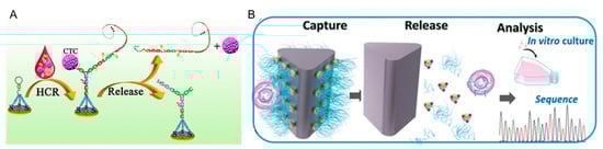 Compared with monovalent aptamers, multivalent aptamers were also applied to enhance binding affinity to CTCs. Yang and his coworkers have made a great progress toward capturing and releasing CTCs in a controllable approach using DNA nanostructures with multivalent recognition elements [67,68,69]. They engineered a deterministic lateral displacement (DLD)-patterned microfluidic chip modified with multivalent aptamer-functionalized gold nanoparticles to enhance CTCs capture efficiency (Figure 4B). The multivalent aptamer enhanced CTCs capture efficiency by more than 300% compared with a monovalent aptamer. Moreover, the captured CTCs were released through a thiol exchange reaction with up to 80% release efficiency and 96% of cell viability, which facilitated downstream CTCs culture and analysis [67].