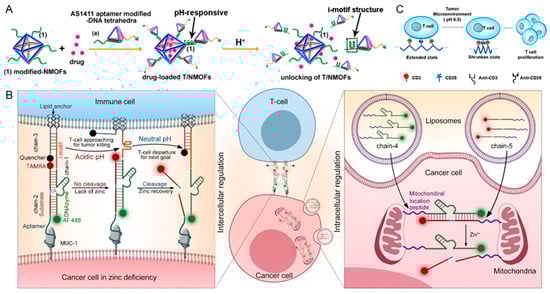 (A) Assembly of the DOX-loaded T/NMOF hybrids and the pH-induced release of the loads [84]. Reproduced with permission from ACS Nano, published by American Chemical Society, 2021. (B) Molecular machines based on engineering DNAzyme and pH-induced interactions between T Cells and cancer cells [86]. Reproduced with permission from Angew. Chem. Int. Ed., published by Wiley, 2022. (C) pH-driven iDNS for in vivo activation of T-cell proliferation [87]. Reproduced with permission from Nano Lett., published by American Chemical Society, 2022.