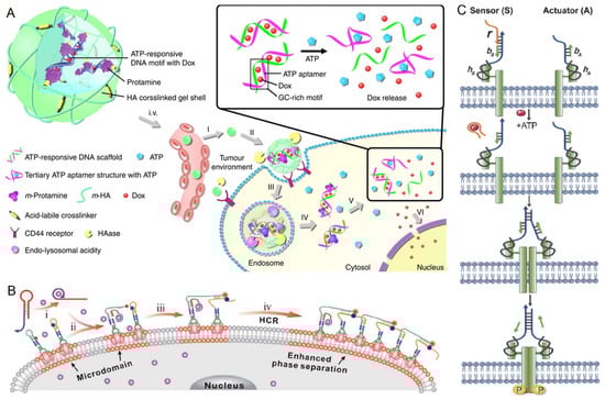 Schematic design of (A) ATP-triggered Dox release system [88]. Reproduced with permission from Nat. Commun., published by Nature, 2014. (B) ATP-activated hybridization chain reaction on the cell membrane that enhances membrane phase separation [89]. (i) Initiator I opening by ATP; (ii) H1 opening by initiator I; (iii) H2 opening by H1; (iv) HCR reaction. Reproduced with permission from Chem. Sci., published by The Royal Society of Chemistry, 2022. (C) ATP-responsive D-CID [90]. Reproduced with permission from Angew. Chem. Int. Ed., published by Wiley, 2018.