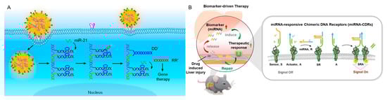 Using disease-associated extracellular miRNAs as input signals, Nie et al. presented a modular and programmable miRNA-responsive DNA nanodevice for biomarker-driven therapy (Figure 8B) [95]. The designed chimeric DNA receptor was grafted on a natural membrane receptor by virtue of aptamer anchoring, and the extracellular miRNA could trigger complementary-mediated strand displacement reaction to autonomously induce dimerization-mediated receptor activation. The in vivo experimental results demonstrated the promoted MET signaling of hepatocytes and in situ repair and liver function restoration of this DNA nanodevice.