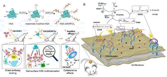 Using the recognition of aptamers to cell membrane proteins, Yang et al. proposed a two-step self-assembling strategy based on the selective Watson−Crick base pairing properties of oligonucleotides (Figure 9A) [97]. This pretargeting−postassembly approach multivalently tethers receptor-prebound antibodies to albumin at the cell surface, allowing sequential actions of receptor binding and clustering to induce cell death.