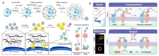 Liu et al. designed a DNA copolymer nanocage that self-assembled on the cell membrane to encapsulate individual T cells and could be peeled off from cell membrane upon UV irradiation (Figure 10A) [100]. The photo-responsive DNA nanocage contained a self-quenched IFN- γ aptamer, which responded to IFN- γ secretion and restored fluorescence to indicate the activity of individual T cells. The wrapping of DNA nanocage confined the diffusion of secreted IFN- γ and eliminated interference from nearby cell secretion. Afterwards, active T cells were collected via flow cytometry and cell sorting, and subsequently exposed to 5 min of ultraviolet radiation to release nanocages from the cell membrane. Jurkat cells and CD19 CAR-T cells with higher activity were successfully selected with enhanced downstream cell activation and cancer cell killing capability. Yang et al. proposed a nongenetic approach for logic actuation of endogenous receptor assembly and corresponding modulation of signal transduction via aptamer recognition and receptor assembly (Figure 10B) [101]. Under the activation of nucleic acid molecules and/or light irradiation, DNA logic assembly brings c-Met and CD71 into close proximity, which interfered with the ligand–receptor interactions of c-Met. This programmable design has been successfully exemplified for modulating cellular signal transduction and provides a convenient tool for biomedical applications.
