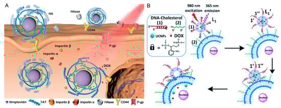 Considering the poor tissue penetration and phototoxicity of UV or visible light, near-infrared (NIR) light is more appropriate for biomedical applications. Ju and Liu et al. designed a DNA–azobenzene nanopump for rapid and efficient drug release through combining DNA nanostructures with upconversion nanoparticles (UCNPs), which converted NIR light to UV and visible light (Figure 11A) [102]. DNA hybrids that assembled on UCNPs continuously switched configuration upon NIR irradiation, which act as the pump-type switcher. The anticancer drug doxorubicin (DOX) can selectively insert into GC base pairs of DNA for efficient loading. The continuous rotation–inversion movement of the phenyl moiety of azo in the hybridization zone of DNA backbones (DNA strands LAAzo, LCAzo with three azo moieties per DNA strand) resulted in the switching of DNA hybridization and dehybridization status, which facilitated DOX release. Moreover, HIV-1 TAT is a nuclear localization peptide that was conjugated to the DNA–azo nanopump for nuclear targeting. Itamar Willner’s group introduced different orthonitrobenzyl phosphate protective nucleic acids as functional units to induce liposome cell fusion processes (Figure 11B). Liposome L1 was loaded with upconversion nanoparticles (UCNP) and doxorubicin (DOX), which emitted light at 365 nm under near-infrared radiation (980 nm). HeLa cells were functionalized with a cholesterol-labelled DNA strand, and liposome was modified with complimentary DNA strand. The hybridization of the HeLa DNA strand and liposome DNA strand was prevented by a photo sealing strand, which was cleaved upon NIR irritation and facilitated liposome–cell fusion, thus realizing the space–time control of membrane fusion [103].