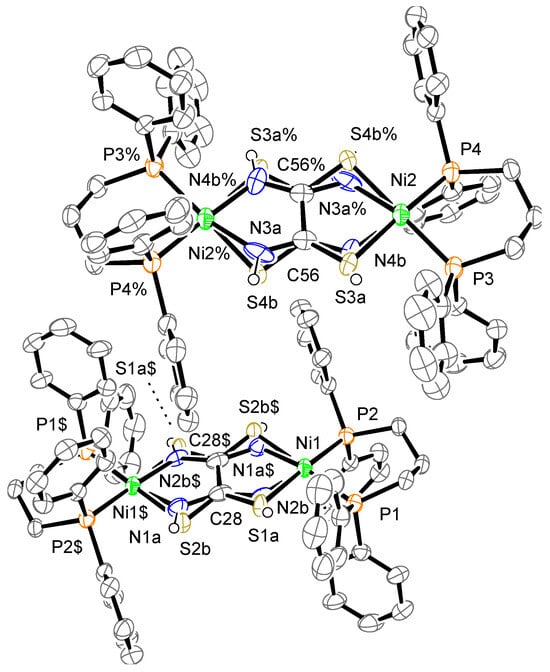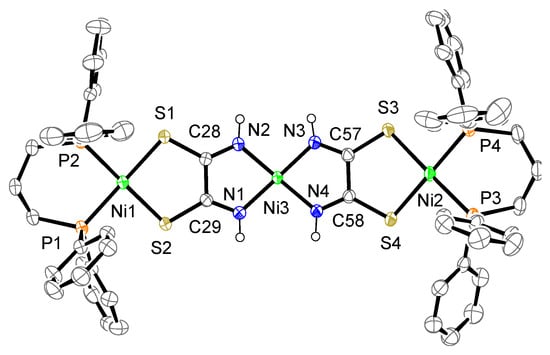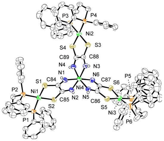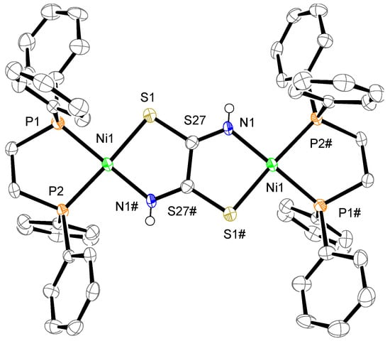 - Kopel, P.; Březina, F.; Trávníček, Z.; Šindelář, Z.; Lasovský, J.; Marek, J. Nickel complexes with sulphur and nitrogen donor ligands, crystal and molecular structure of [(PPh3)2Cu(DTA)Ni(DTA)Cu(PPh3)2] (H2DTA = dithiooxamide). Polyhedron 1995, 14, 991–996. [Google Scholar] [CrossRef]
