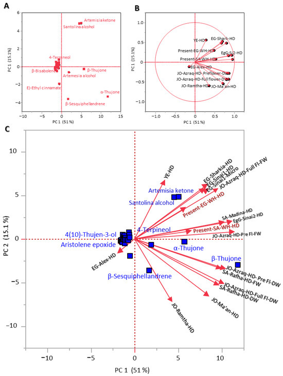 Principal component analysis (PCA) and cluster analysis of Achillea fragrantissima and 15 other reported samples of A. fragrantissima in different locations around the world depending upon the EOs’ main components (>2.5%). (A) PCA compounds score plot, (B), PCA variables and (C) PCA biplot.
