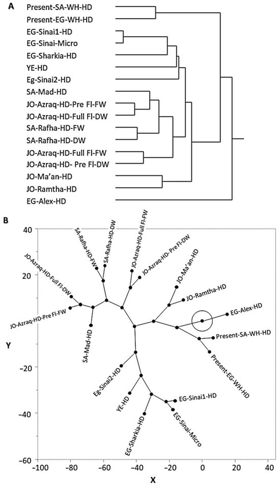 Cluster analysis including hierarchical clustering (A) and constellation plot (B) of A. fragrantissima along with 15 reported A. fragrantissima ecospecies collected from several locations around the world, based upon the main EO components’ concentration.