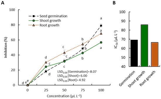 Allelopathic activity of the essential oils isolated from Egyptian ecospecies of Achillea fragrantissima. (A) Effect of different concentration on the seed germination, seedling shoot growth, and seedling root growth of C. murale, and (B) the IC50. Different letters within each parameter mean values significant at p ≤ 0.05.