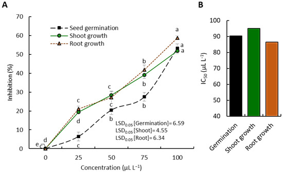 On the other hand, the EO of the Egyptian ecospecies of A. fragrantissima showed considerable allelopathic activity on the seed germination and seedling growth of C. murale. At the highest concentration of the EO (100 µL L−1), the seed germination of C. murale was retarded by 53.2%, while the seedling shoot growth was decreased by 51.9%, and finally, the seedling root growth was diminished by 58.8% (Figure 4A). Regarding the IC50, the root growth attained the lowest IC50 value (86.5 µL L−1), while the shoot growth and seed germination showed IC50 values of 95.0 and 90.3 µL L−1, respectively (Figure 4A).