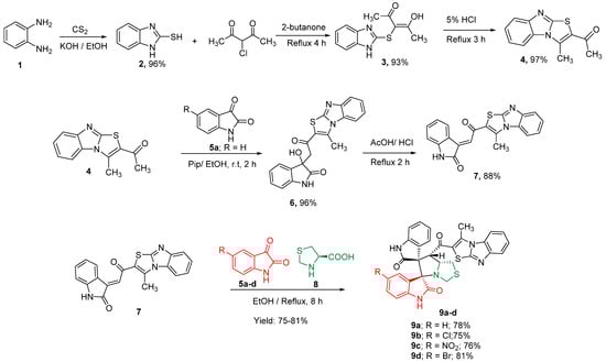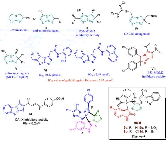 Thiazolo[3,2-a] benzimidazole is an important heterocyclic privileged structure in medicinal chemistry possessing a wide range of biological activities. Thiazolo[3,2-a] benzimidazole is a fused bicyclic compound containing sulfur and nitrogen, which exist in nature, and synthetically inspired chemical structures with divergent medicinal targets and agrochemicals [,]. Several representative compounds incorporating this interesting scaffold have been shown to be anti-microbial and anti-cancer agents; such as compounds I and II, which exhibit anti-microbial activity [,,]. Compound I, which has a trade name of Levamisole, is sold to fight and treat parasitic worm infections including ascariasis and hookworm infections, as shown in Figure 1. Compounds III–IX possess high efficacy halting different types of cancer cells with specific targets [,,,,]; for example, compounds III and VIII target p53-MDM2 protein–protein interaction inhibitors as a target therapy for cancer treatment. Compound IV shows CXCR2 antagonists; on the other hand, compound IX exhibits carbonic anhydrase (CA IX) inhibitory activity as a promising target cancer therapy []. In 2021, Eldehna, W.M. et al. reported a set of compounds depending on the structure of the isatin lead compound with the thiazolo[3,2-a] benzimidazole scaffold, obtaining a novel and potential CDK2 inhibitor with in vitro apoptotic anti-proliferative activity. The most active candidates showed potential CDK2 inhibition with nano-molar reactivity up to 96.46 nM [].