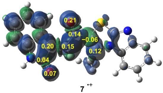3D representation of the Mulliken atomic spin densities of the radical anion of chalcone 7, together with the electrophilic Parr functions of chalcone 7 at the most relevant centers.