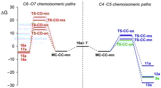 Taking into account the formation of MC-CC-mn, the activation Gibbs free energies for the competitive isomeric reaction paths range from 8.6 (TS-CC-on) to 12.7 (TS-CC-ox) kcal·mol−1 for the addition on the C4–C5 double bond, and from 16.6 (TS-CO-on) to 26.4 (TS-CO-mn) kcal·mol−1 for the addition on the carbonyl C6–O7 bond. The reactive pseudo(mono)radical structure previously characterized [] for AY 10a contributes to these low activation barriers. Furthermore, while the chemoisomeric C4–C5 reaction paths are highly exergonic. from 28.0 (13a) to 14.7 (11a) kcal·mol−1, rendering the corresponding addition on the C4–C5 double bond irreversible under the reaction conditions, the C6–O7 reaction paths are only slightly exergonic, from 5.0 (14a) to 4.0 (16a), making the corresponding addition on the C6–O7 bond reversible. Consequently, the 32CA reaction involving the C4–C5 double bond of chalcone 7 is clearly favored both kinetically and thermodynamically over the one involving the carbonyl C6–O7 bond.