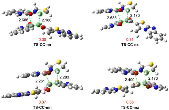 Figure 4 displays the optimized geometries of the four isomeric transition state structures (TSs) associated with the more favorable 32CA reaction on the C4–C5 double bond in ethanol. The C–C distances between the interacting carbons reveal that, while the ortho regioisomeric TSs are related with highly asynchronous bond formation processes, the meta TSs are rather synchronous, especially TS-CC-mn with a ∆l = 0.02 Å (see Figure 4). With the exception of synchronous TS-CC-mn, the shorter C–C distance in the other three TSs involves the C3 carbon of the thiazole ring of AY 10a. Similarly, except for TS-CC-mx, formation at the C5 carbon of chalcone 7 is more advanced. This implies that at the more favorable ortho regioisomeric reaction paths, the preferred two-center interaction is that between the C3 and C5 carbons. The most stable TS-CC-on, characterized by C3–C5 and C1–C4 distances of 2.186 and 2.688 Å, respectively, shows the highest degree of asynchronicity, though it is very similar to TS-CC-ox. Examining the intrinsic reaction coordinate (IRC) path [] from the most favorable TS-CC-on to 9a reveals that the 32CA reaction indeed follows a non-concerted two-stage one-step mechanism [], characterized by complete formation of the first C3–C5 single bond before initiating the formation of the second C1–C4 single bond (see Figure S20 in Supplementary Materials).