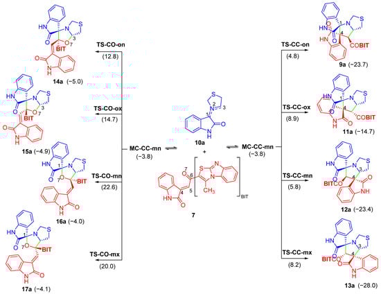 A theoretical MEDT [] study was conducted to comprehend the experimental formation of spiro compounds 9a–d through the final 32CA reaction step of the reported process (see Scheme 1). To do so, the 32CA reaction of chalcone 7 with the simplest AY 10a, generated in situ through the reaction between isatin 5a and (R)-thiazolidine-4-carboxylic acid 8, was theoretically investigated as the reference prototype.