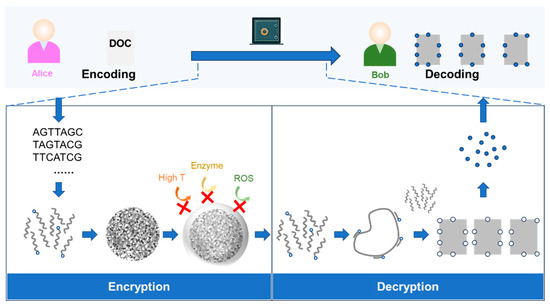 As time passes, the issue of message security has gained significant prominence; ensuring the confidentiality and integrity of messages is an urgent issue that needs to be solved [1]. To address this issue, complex cryptographic methods that rely on challenging computational problems have been devised to facilitate secure communication [2,3,4]. However, the development of computer technology and the progress of hardware have made it possible to crack cryptographic protocols by brute force attacks in a short time [5]. Biomolecular cryptography utilizes highly specific thermodynamic control of biomolecular interactions to implement encryption schemes. Based on the existing technology, this type of encryption is difficult to brute-force crack in a short period. DNA, serving as a crucial repository of human genetic data, possesses inherent characteristics of exceptional precision and high information density, making it an ideal medium for message storage [6,7,8]. The designability of the DNA sequences provides a convenient condition for encrypting messages into the DNA and reading messages from the DNA. Clelland et al. [9,10] used this property to develop a DNA-based steganography scheme to hide secret messages, and Wong et al. [11] reported on the data storing in DNA in prokaryotic organisms. DNA data storage is a biological device that has received widespread attention for a long time [12,13]. Based on this characteristic, our research group developed the DNA origami cryptography (DOC) technology [14]. We encrypted messages into the sequential point patterns that were implemented physically through a combination of scaffold strands. By combining DOC with a steganography algorithm and pattern encryption, the confidentiality of DOC was further enhanced. Through the application of DOC technology, we’ve successfully achieved encrypted transmission for various types of data, including text, patterns, and musical notes.