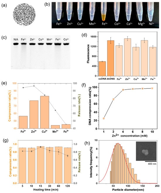 (a) Schematic diagram of DNA nanosphere; (b) optical image of nanosphere precipitation formed by different metal ions with DNA; (c) dPAGE diagram of DNA strands released by DNA nanosphere prepared by different metals; (d) fluorescence intensity diagram of DNA released by DNA nanosphere prepared by different metals after hybridization to form double strand stained by SGI; (e) diagram of DNA compression and release rate of different metal ions; (f) trend diagram of DNA compressibility of Zn2+ at different concentrations; (g) compressibility and corresponding release rate of 4 mM Zn2+ compressed DNA at different times; and (h) particle size distribution of DNA nanosphere. The inserted image was the SEM image of the corresponding DNA nanosphere.
