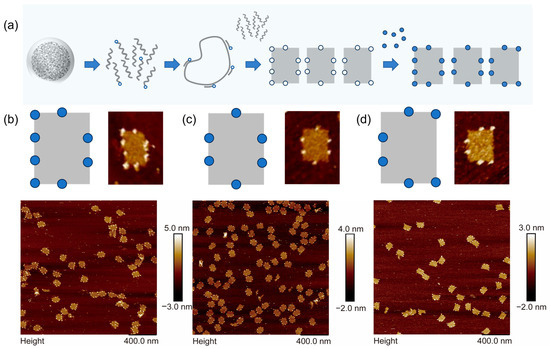 In the process of DNA origami, the staple was mixed with the scaffold carrying M-strands at a ten-fold overdose ratio in 1 × TAE buffer with 12.5 mM Mg2+, and the final concentration of the scaffold strand was 2 nM. Subsequently, the mixture was heated at 57 °C for 3 min and then annealed by a step at a rate of −5 °C per minute until it reached 27 °C. Afterward, the folded DNA origami was subjected to three rounds of purification by centrifuge filters with 100 kDa (MWCO) to eliminate any excess strands. A ten-fold excess of streptavidin was added to identify biotin with the single strand on DNA origami. After incubating at room temperature for 2 h, the resulting patterns were characterized under AFM.