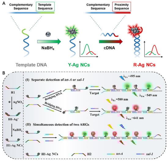 - Chen, N.; Gong, C.; Zhao, H. Dual-Channel Fluorescence Detection of Antibiotic Resistance Genes Based on DNA-Templated Silver Nanoclusters. Sci. Total Environ. 2023, 882, 163559. [Google Scholar] [CrossRef]