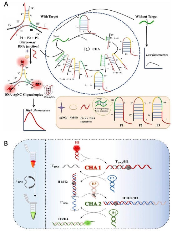 (A) The principle of a label-free and enzyme-free method for DNA detection based on CHA and DNA-Ag NCs, reproduced with permission from Ref. [65]. Copyright 2022, Elsevier B.V. Publishers. (B) The cascaded CHA for ratiometric detection of circRNA with chameleon DNA-Ag NCs, reproduced with permission from Ref. [66]. Copyright 2022, Elsevier B.V. Publishers.