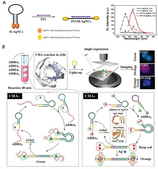 Our group acquired one type of DNA-Ag NC-based dimeric structure (H-Ag NCs) with a DNA template of hairpin DNA containing two C-rich emitter-nucleation sequences (Figure 5A) [67], and two fluorescence emissions at 565 nm and 630 nm were produced. Moreover, the fluorescence can be regulated via loop hybridization with an input of IN1, leading to inverse intensity changes at the two wavelengths. Based on the alteration of dimeric DNA-Ag NCs and consequent fluorescence change, a series of concomitant contrary logic gates, e.g., INHIBIT^IMPLICATION, XOR^XNOR, and MAJORITY^MINORITY, and complicated logic circuits (e.g., parity generators and checkers) were obtained. This work provided one new approach to fabricating cost-effective logic systems. On the basis of head-to-head dimerization of DNA-Ag NCs and concomitant fluorescence change, an in situ imaging platform was developed for rapid identification of fusion gene subtypes and subtype (e13a2 and e14a2) [2]. As shown in Figure 5B, four DNA-Ag NC-loaded hairpin DNA fuels (ADHA1, ADHA2, ADHA3, and ADHA4) were prepared for recognizing e13a2 and e14a2 with CHA1 and CHA2, respectively. As a result, duplex products with two DNA-Ag NC emitters were obtained with green emission and utilized for e13a2 quantitation; moreover, the duplexes with two groups of dimeric DNA-Ag NCs as deep red emitters were employed for e14a2 detection and can be transformed into those with strong orange emission in the presence of Ag+. Accordingly, fluorescence imaging of e13a2 (green), e14a2 (orange), and e13a2/e14a2 (orange/green) were realized.