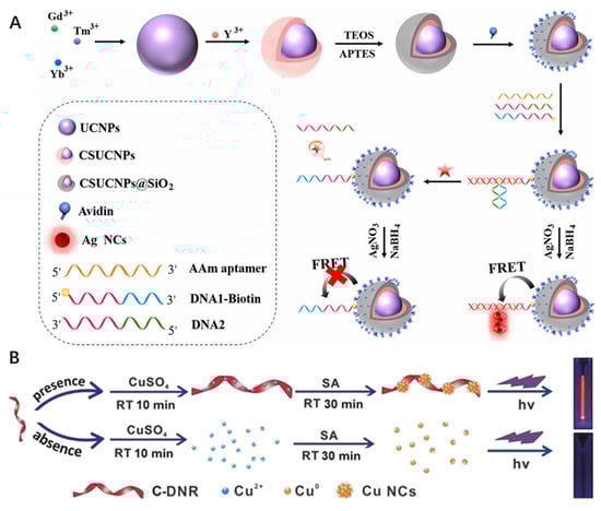 (A) A scheme illustrating Aam detection based on FRET between SCUCNPs and DNA-Ag NCs, reproduced with permission from Ref. [68]. Copyright 2022, Elsevier B.V. Publishers. (B) DNA nanoribbon-guided DNA-Cu NC synthesis and fluorescence improvement, reproduced with permission from Ref. [69]. Copyright 2020, Wiley-VCH Publishers.