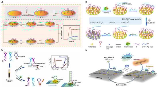 Owing to their advantages of low toxicity, high stability, good water solubility, easy preparation, and biocompatibility, DNA-MNCs are deemed as promising ECL luminophores in bioanalytical methods. For instance, a label-free ECL biosensor for ultrasensitive detection of RNase H activity was developed by using DNA/RNA duplex-templated Cu NCs as novel excellent ECL emitters (Figure 7A) [96]. RNase H can specifically bind to a DNA/RNA duplex, leading to digestion of RNA chains and a decrease in the ECL signal from Cu NCs. The method exhibited a broad linear range from 3 × 10−3 U/mL to 20 U/mL with a detection limit of 1.97 × 10 −3 U/mL, and satisfactory accuracy in detecting RNase H in human serum indicated great potential for further application in clinical diagnostics. DNA-MNCs can also act as energy acceptors to quench ECL of QDs due to RET between QDs and MNCs. An ECL-RET sensor to achieve effective and sensitive detection of telomerase activity was developed [97]. The specific principle is shown in Figure 7B. The hairpin DNA (H) and telomerase primer were connected to the surface of the CdS QD modified electrode. In the presence of telomerase extract and deoxyribonucleotides (dNTPs), the telomerase primer was extended, and long chains with repeated sequences (TTAGGG)n that can be hybridized with S DNA were produced. The formation of a DNA walker with multiple S “legs” circularly triggered H cleavage at its specific site by the endonuclease (Nt. BbvCI), and, subsequently, probe-Ag NCs were bound to residual DNA fragments of H and quenched the ECL of CdS QDs on the electrode. The DNA walker as a dynamic DNA nanomachine [98,99,100,101,102] is quite useful in biological analysis due to its excellent mobility and controllability [103]. It should be noted that, unlike traditional single-legged DNA walkers [99,104,105], the multi-legged DNA walker initiated multiple signal responses, thereby shortening walking time and improving signal amplification efficiency.