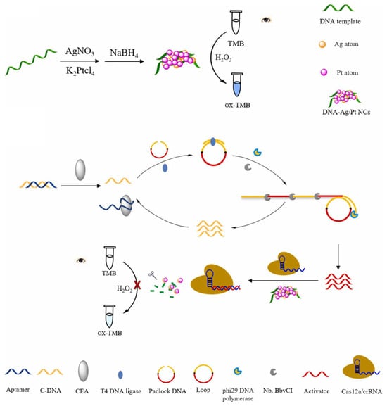 Based on POD-like activity of DNA-Ag/Pt NCs and in combination with nucleases-assisted DNA amplification, Mu et al. established an amplified colorimetric sensing system for detection of a cancer biomarker (carcinoembryonic antigen, CEA) [118]. As shown in Figure 9, DNA-Ag/Pt NCs can catalyze the oxidation of 3,3,5′,5′-tetramethyl benzidine (TMB) by H2O2 to generate blue substance ox-TMB, and by integrating RCA restriction endonuclease (Nb.BbvCl) and CRISPR/Cas12a reactions, CEA can be sensitively determined by naked eyes. In addition to DNA-Ag/Pt NCs, DNA-Cu NCs and DNA-Au NCs also exhibit apparent catalytic activity. Borghei and coworkers reported that DNA (poly T)-Cu NCs with green fluorescence exhibited POD activity comparable to natural enzymes and proposed a colorimetric method for detecting miRNA based on the inhibition of the catalysis toward the oxidation of methylene blue (MB) [119]. A dynamic range of 1.0 pM to 10.0 nM and an ultralow LOD of 0.6 pM were obtained.