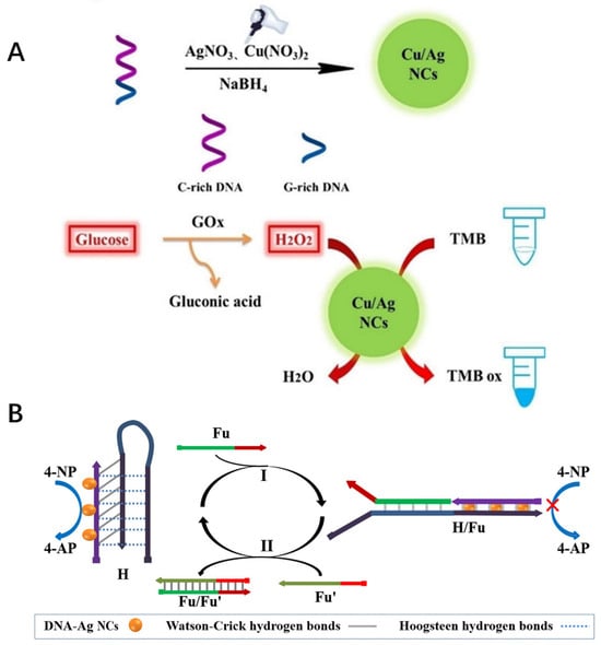 (A) Preparation of DNA-Cu/Ag NCs with a C/G-rich DNA sequence and their application for glucose based on POD-like catalytic activity, reproduced with permission from Ref. [120]. Copyright 2020, Wiley-VCH Verlag GmbH & Co. KGaA Publishers. (B) Reversible regulation of catalytic activity of DNA-Ag NCs based on their differential interactions with DNA structures and stimuli-responsive structural transition, reproduced with permission from Ref. [4]. Copyright 2020, Wiley-VCH GmbH Publishers.