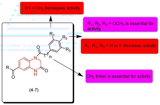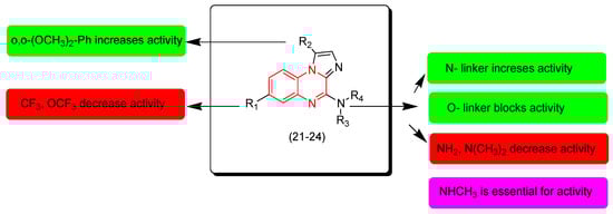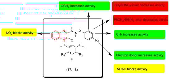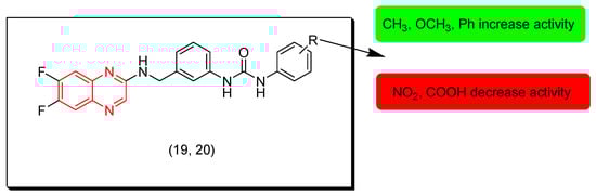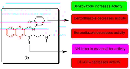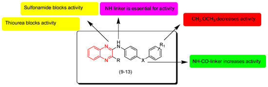- The aromatic ring of the quinoxaline nucleus can be substituted with halogens such as Cl or F at the sixth and/or seventh position/s to increase the activity.