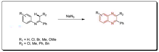 - Chen, T.; Chen, X.; Wei, J.; Lin, D.; Xie, Y.; Zeng, W. Copper-catalyzed cascade Cycloamination of α-csp3–H Bond of N-aryl Ketimines with azides: Access to Quinoxalines. Org. Lett. 2016, 18, 2078–2081. [Google Scholar] [CrossRef] [PubMed]