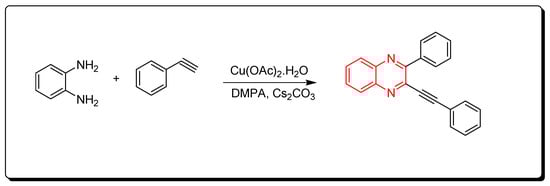 - Wang, W.; Shen, Y.; Meng, X.; Zhao, M.; Chen, Y.; Chen, B. Copper-catalyzed synthesis of quinoxalines with o-phenylenediamine and terminal alkyne in the presence of bases. Org. Lett. 2011, 13, 4514–4517. [Google Scholar] [CrossRef] [PubMed]