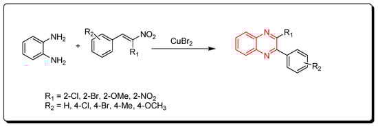 - Chen, Y.; Li, K.; Zhao, M.; Li, Y.; Chen, B. Cu(II)-catalyzed synthesis of quinoxalines from o-phenylene diamines and nitroolefins. Tetrahedron Lett. 2013, 54, 1627–1630. [Google Scholar] [CrossRef]
