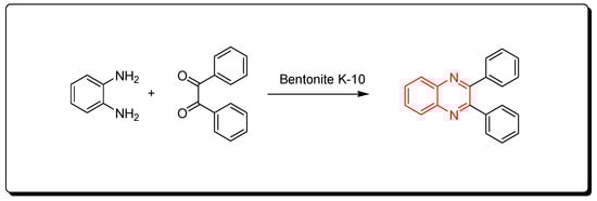 - Jeganathan, M.; Dhakshinamoorthy, A.; Pitchumani, K. One-pot synthesis of 2- substituted quinoxalines using K10-montmorillonite as heterogeneous catalyst. Tetrahedron Lett. 2014, 55, 1616–1620. [Google Scholar] [CrossRef]