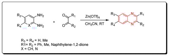 - Subrahmanyam, S.C.; Narayanan, S. Synthesis of Quinoxalines in Presence of Zinc Triflate. Asian J. Chem. 2011, 23, 1331–1333. [Google Scholar]