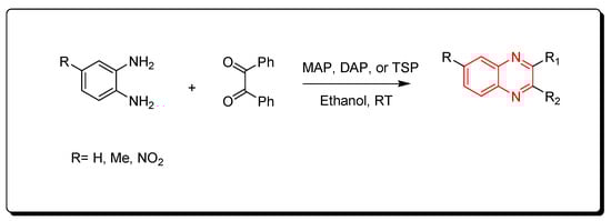 - The green chemistry pathway, which is a cost-effective pathway through using green chemistry methodologies to produce quinoxalines. This pathway is characterized by using an environmentally friendly recyclable catalyst, a low cost, lower consumption of energy, one-pot synthesis, no side products, short time, and high yield. It can be performed in an aqueous medium at room temperature or by the microwave reactor.