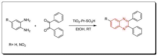 - Atghia, S.V.; Beigbaghlou, S.S. Nanocrystalline titania-based sulfonic acid (TiO2-Pr-SO3H) as a new, highly efficient, and recyclable solid acid catalyst for the preparation of quinoxaline derivatives. J. Nanostruct. Chem. 2013, 3, 38. [Google Scholar] [CrossRef]