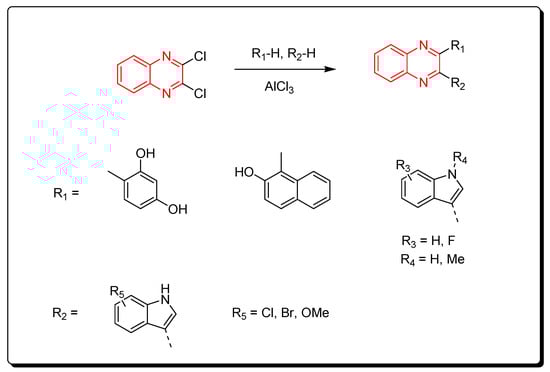 - Kumar, K.S.; Rambabu, D.; Sandra, S.; Kapavarapu, R.; Krishna, R.G.G.; Rao, B.V.M.; Chatti, K.; Reddy, M.C.; Misra, P.; Pal, M. AlCl3 induced (hetero)arylation of 2,3-dichloroquinoxaline: A one-pot synthesis of mono/disubstituted quinoxalines as potential antitubercular agents. Bioorg. Med. Chem. 2012, 20, 1711–1722. [Google Scholar] [CrossRef] [PubMed]