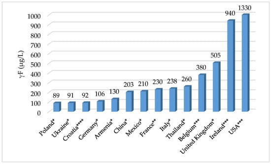 All beer samples tested have an allowable fluoride concentration of 1.5 mg/L in Croatia, which corresponds to the levels recommended by the World Health Organization. These results do not differ significantly from the results for beers from other European producers. In fact, low average fluoride levels were found in the literature for Polish, Ukrainian, German, and Armenian beers [27], while higher levels were found for beers from Thailand, Italy, Mexico, China, Belgium, France, the United Kingdom, and significantly for beers from Ireland and the United States [30]. This could mainly indicate large differences in the fluoride content of water from these countries. Comparing the average fluoride content in beers from Croatian producers with the fluoride content in beer samples from some global producers, it can be seen that Croatian beers have similar fluoride content to beers from Ukraine or Poland (Figure 2).