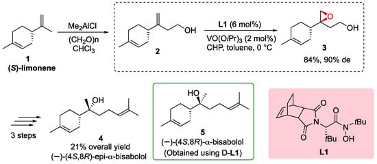 - Makita, N.; Hoshino, Y.; Yamamoto, H. Asymmetric Epoxidation of Homoallylic Alcohols and Application in a Concise Total Synthesis of (−)-α-Bisabolol and (−)-8-epi-α-Bisabolol. Angew. Chem. Int. Ed. 2003, 42, 941–943. [Google Scholar] [CrossRef]
