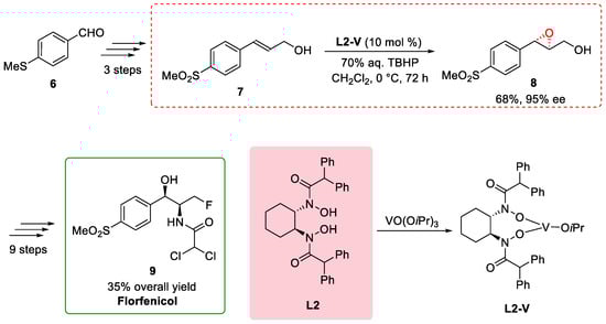 The synthetic pathway commenced with the transformation of 4-methylthiobenzaldehyde 6, leading to the formation of allylic alcohol 7 in three sequential steps. The subsequent critical focus was directed toward the synthesis of the pivotal intermediate (2S,3S)-epoxide 8. While the initial consideration was the Sharpless epoxidation protocol employing anhydrous tert-butyl hydroperoxide (TBHP), its limitations for scale-up necessitated an alternative strategy. Consequently, the authors employed a modified procedure involving 1.5 equivalents of 70% aqueous TBHP and Yamamoto’s vanadium catalyst L2-V at 0 °C for 72 h [8]. This innovative approach successfully furnished (2S,3S)-epoxide 8 with a yield of 75% and an enantiomeric excess of 90%. Recrystallization enhanced further the enantiomeric excess to 95%. Subsequently, an additional nine steps were executed to achieve the desired product, Florfenicol 9, with an overall yield of 37% [12]. The successful total synthesis of Florfenicol demonstrates the significant contribution of chiral BHA ligands in the synthesis of important pharmaceutical compounds. The broad-spectrum antibiotic properties and widespread applications of Florfenicol highlight the importance of efficient synthetic methodologies to access such valuable compounds (Scheme 2) [13].