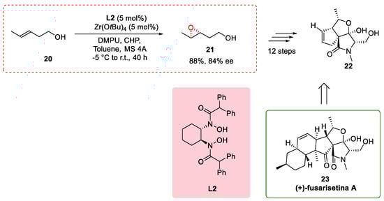In their study, Kohyama et al. (2015) utilized a novel methodology in the partial synthesis of (+)-fusarisetin A, a pentacyclic fungal metabolite known for its intriguing biological properties, including its role as an acinar morphogenesis inhibitor [18]. The researchers specifically focused on the transformation of homoallylic alcohol 20, employing the conditions described by Yamamoto and coworkers [8]. By utilizing chiral bishydroxamic acid ligand L2, Zn(OtBu)4, and DMPU, they successfully formed the corresponding epoxide 21 with an impressive enantiomeric excess of 84% and a yield of 88%. Furthermore, through an additional twelve steps, the desired compound 22 was obtained, representing a significant milestone in the synthesis of (+)-fusarisetin A. These steps involved various transformations, including functional group manipulations, ring formations, and stereochemical control, enabling the construction of the intricate pentacyclic structure of (+)-fusarisetin A. Notably, this study revealed the critical role of the metal core in controlling the enantioselectivity of the reaction, with chiral BHA ligands L2 and hafnium catalyst leading to improved enantiomeric excesses (Scheme 5) [19]. The successful application of this methodology in the partial synthesis of (+)-fusarisetin A not only enhanced our understanding of the compound’s synthetic pathway but also highlighteds its potential for the efficient synthesis of complex natural products and other valuable compounds.