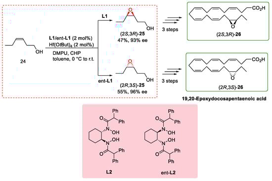 The total synthesis of fatty acids is a challenging task, especially when large quantities of materials are required for biological assays. Within this context, the synthesis of specific unsaturated fatty acids containing an epoxide group is of particular importance as they play crucial roles as endogenous lipids [20]. To address this challenge, Cinelli et al. reported the total synthesis of 19,20-epoxydocosapentanoic acid (19,20-EDP), which is a significant compound with biological relevance. Previous synthetic routes for fatty acids do not offer a direct method for the epoxidation of alcohols, resulting in poor outcomes. In their study, the researchers focused on the transformation of homoallylic alcohol 24 into the corresponding epoxy alcohols (S,R) and (R,S)-25. They employed L2 and ent-L2 ligands in conjunction with Hf(OtBu)4 as the catalyst. Although the yield and enantioselectivity achieved were modest and lower than the reported values, this study represented the first report of utilizing BHA ligands in the total synthesis of these exciting compounds. Scheme 6 illustrates the key steps involved in the total synthesis of 19,20-EDP. Despite the challenges faced in achieving high yields and enantioselectivity, this work showcased the potential of BHA ligands in the total synthesis of complex fatty acids, expanding the synthetic scope and paving the way for the efficient synthesis of important bioactive compounds (Scheme 6) [21].