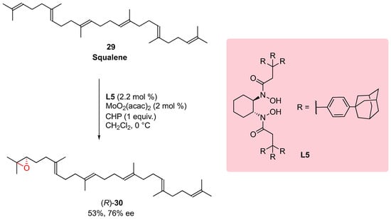 In the intricate synthetic pathway illustrated in Scheme 8, the foundational biogenetic precursor squalene 29, integral in the synthesis of steroids and polycyclic terpenoids, underwent a transformation under specified conditions. This synthetic experiment culminated in the formation of 2,3-epoxysqualene 30, showcasing a remarkable enantioselectivity of 76%. Squalene, classified as a triterpene hydrocarbon, plays a pivotal role as an intermediate in the biosynthesis of diverse biologically active molecules. To strategically introduce an epoxide group at a specific position within the squalene molecule, the researchers meticulously tailored reaction conditions conducive to this transformation. The optimization of these conditions yielded the desired 2,3-epoxysqualene 30, demonstrating a substantial enantioselectivity of 76%. This heightened enantioselectivity serves as a clear indicator of the successful application of the chosen ligand or catalyst system in precisely controlling the stereochemistry of the reaction (Scheme 8) [23].
